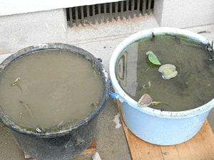 拙HPをご覧いただいている方から、「じぇいさんが与えている肥料では、チッソ過多になっているから、花芽が出ずに、葉っぱばかりが茂るのでは?」とのご指摘をいただき、「そうかもしれない!(・∀・)/」と思い、早速対策をとってみました。 ![]() 上の写真右のお鍋に入っているのは、「草木灰を水で溶いたもの」。 これの上澄みを、各ロータスさんの水の中に少々加えて、与えてみました。 「草木灰」=リン酸(=花・果実・種子を生長させる)とカリウム(=根や茎を丈夫に育てる)を含む。殺菌作用も少々あるよう。 今回、土づくりの段階で、草木灰は混ぜたんだけど、それだけでは不足だったということかもしれない。 そして、私が愛用している「みずの森オリジナル肥料」の成分は、チッソ6:リン4:カリ3。なるほど。チッソ多いですよね。もしかしたら、今まで立ち葉まで出たのに枯れてたのは、チッソ過多で根腐れを起こしていたから、とも考えられ・・・ もしそうだったなら、この補給で良い結果が得られるかも?かも! ![]() 実生さんたちは、元気!元気!です。 近年に無く、ええ感じ。早い目の植え替えは、「吉」と出たようです。 ![]() 「喜上眉梢(きじょうびしょう)」さん(右・いつもとは逆向いてますが)と、「小舞妃(しょうまいひ)」さん(左)。 あまり、調子が良いとは言えない。 葉っぱばかり・・と言ってる間に、葉っぱすら危ない感じになってきてます。 大丈夫なんかな・・・ 地面に置いてると日の当たりすぎで、焼けてるんじゃないかと、ちょっと上に上げてみました。気持ちだけ。 (ロータスさんを植えてる土の中に棲んでいるアカムシが、水温の上昇に耐えきれず熱中症で死亡→死骸がぷかぷか浮く、という現象が最近起きています。) これで蓮根まで枯らせてしまったら、もう私、本気でロータス栽培から引退しないといけなくなってしまう・・・それだけは避けたい! そして、平沢さんちから来たコダカラソウ1号2号。 ![]() 子供が付いてたのに、落ちてしまった。 やっぱり、「まだ子供なのに、子供を育てられるわけ無いやん!」ってことか? でもまた次の子供が付いてるんだけど・・・ やはり謎の生物やな。 明日は恒例「みずの森と蓮群生地訪問」に行ってきます。 良い蓮いっぱい撮ってくるど〜! |